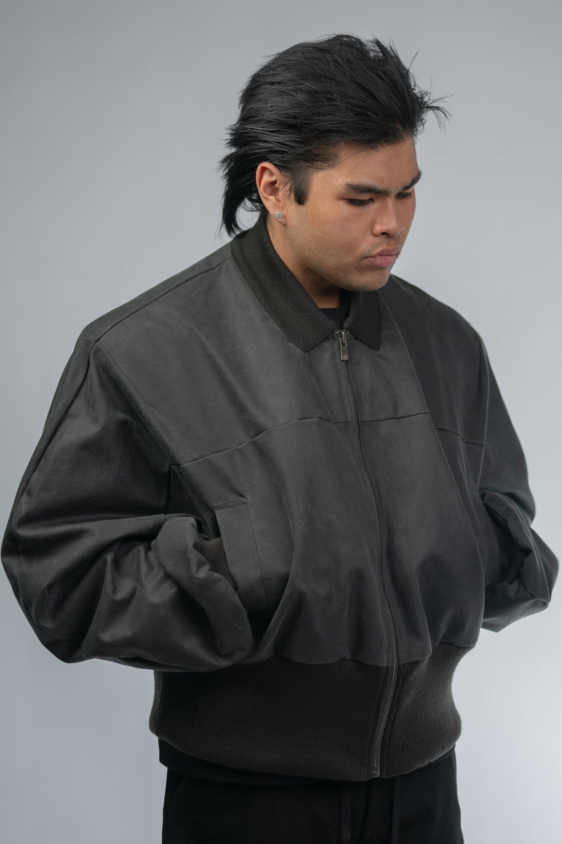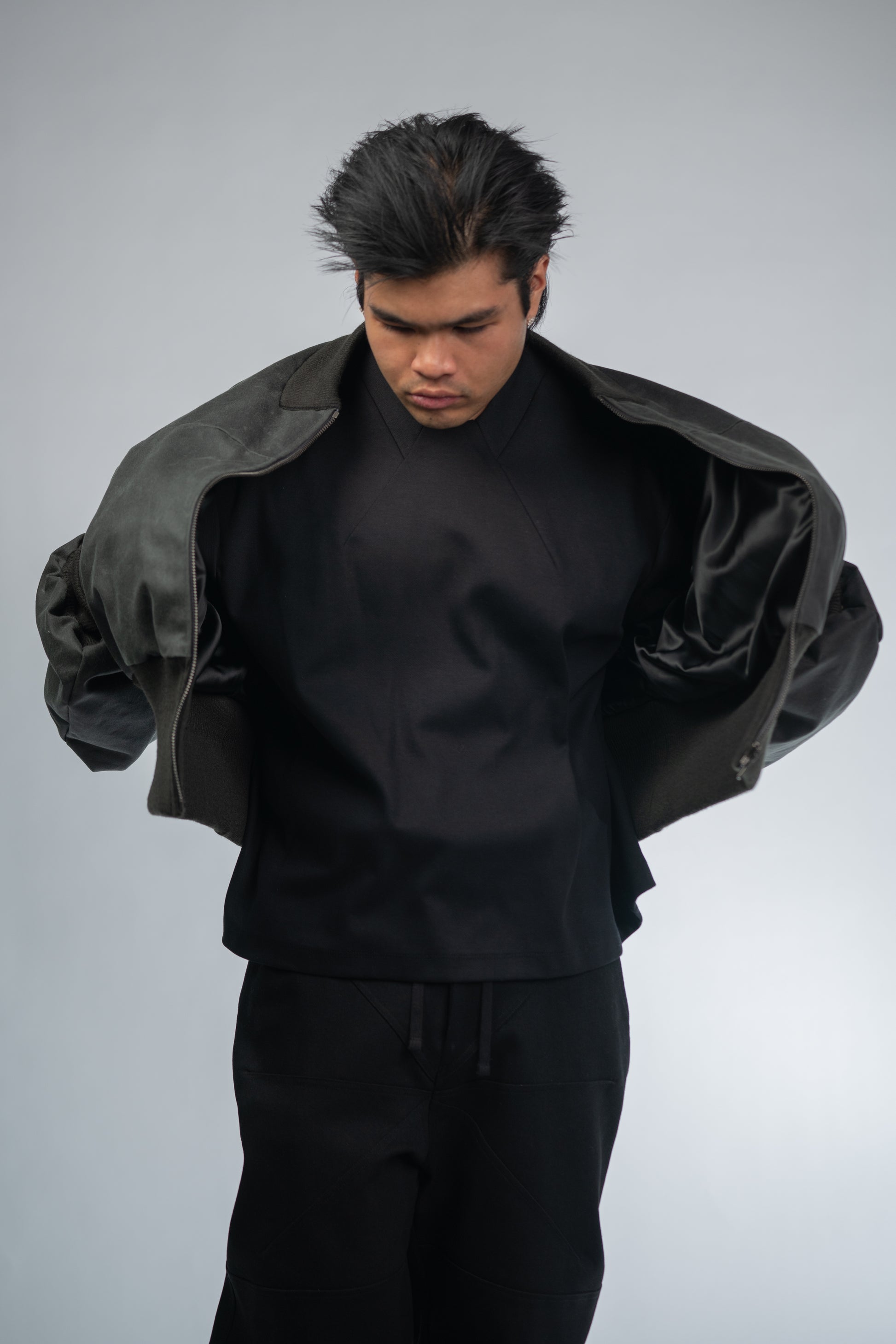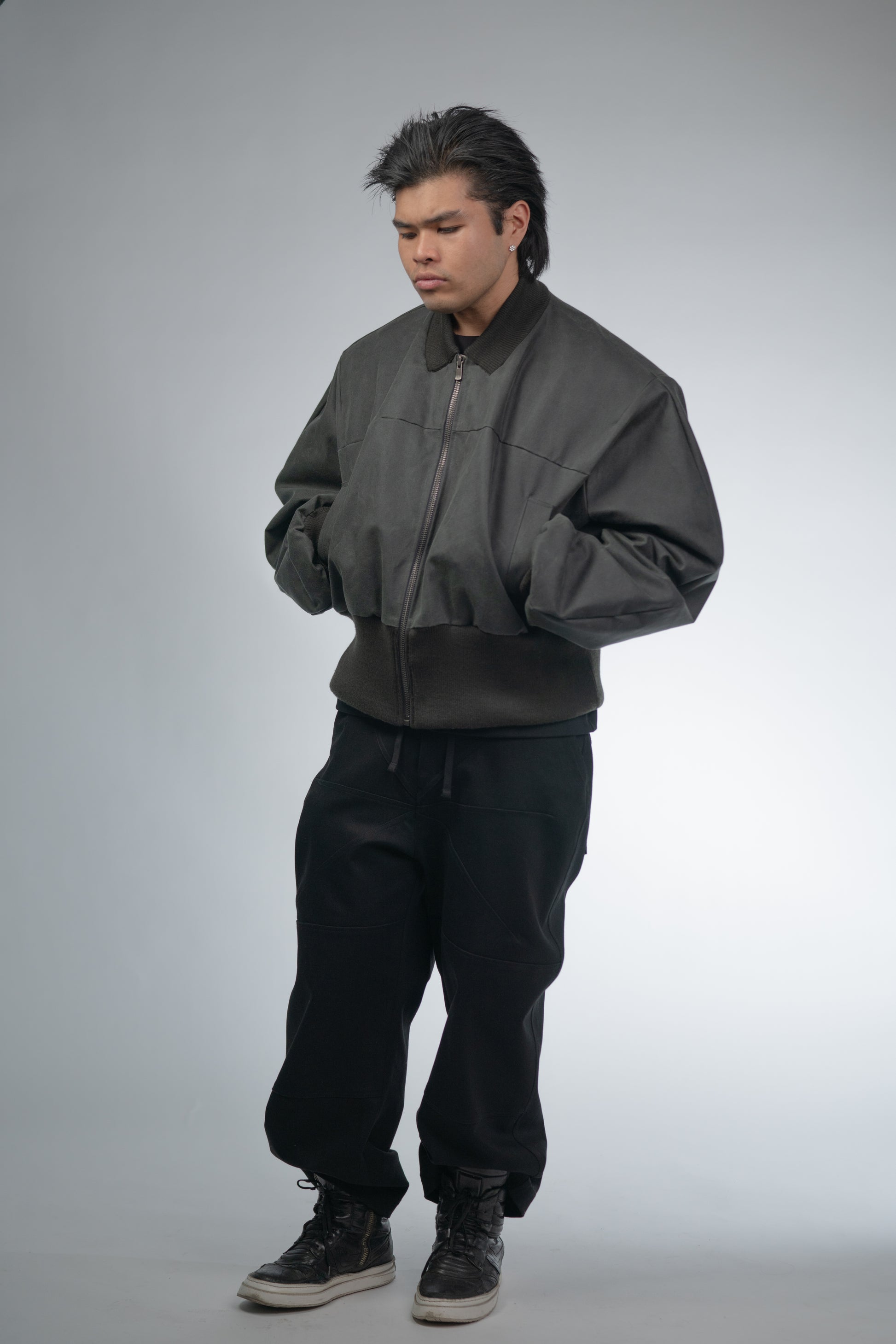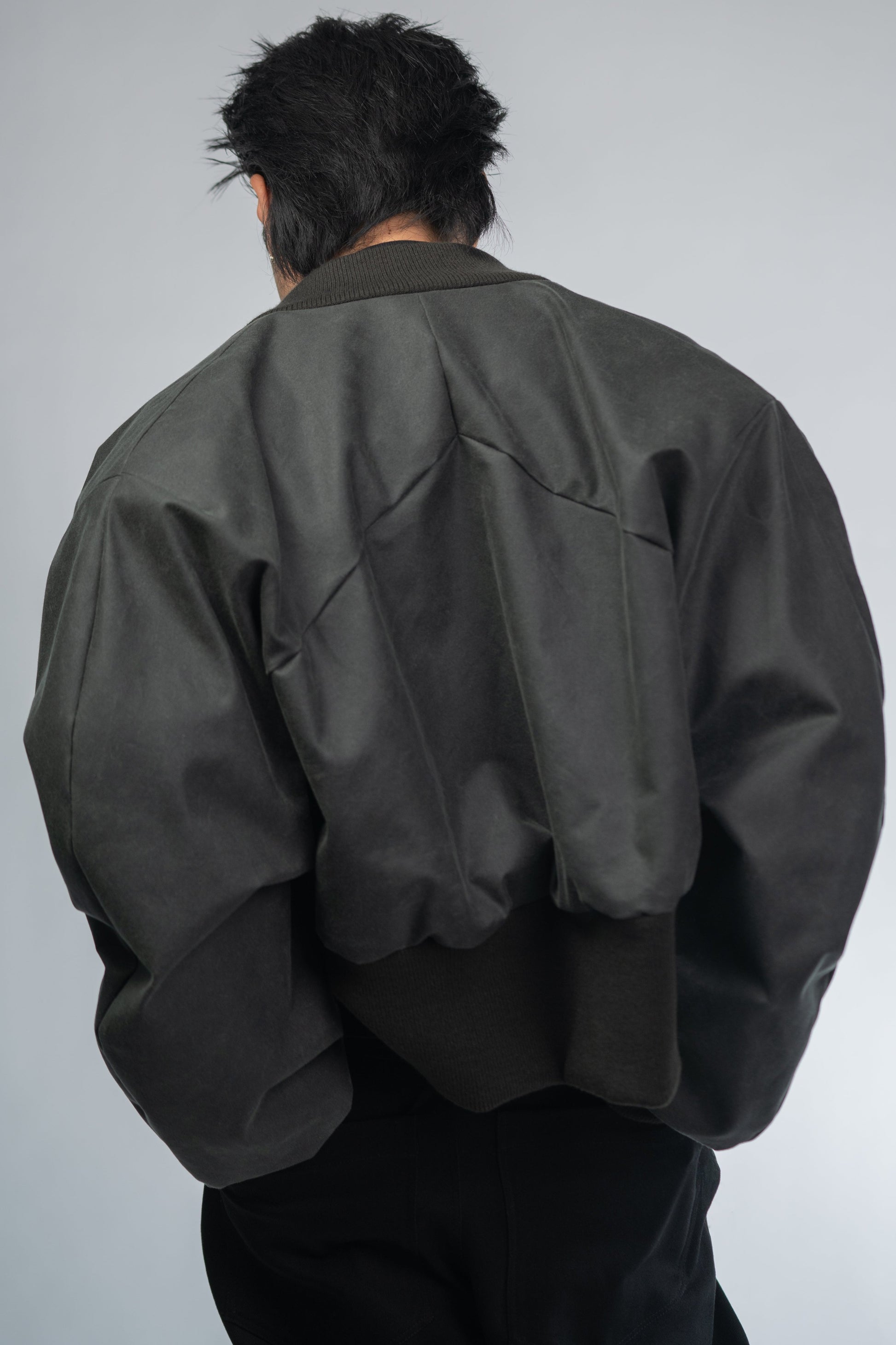 The Biometric Bomber Jacket features an oversized fit, cocoon shaped kimono sleeve with a ribbed gusset at the underarm, darts at the shoulder with shoulder pads, sharp angular stitch details and an elongated rib hem.