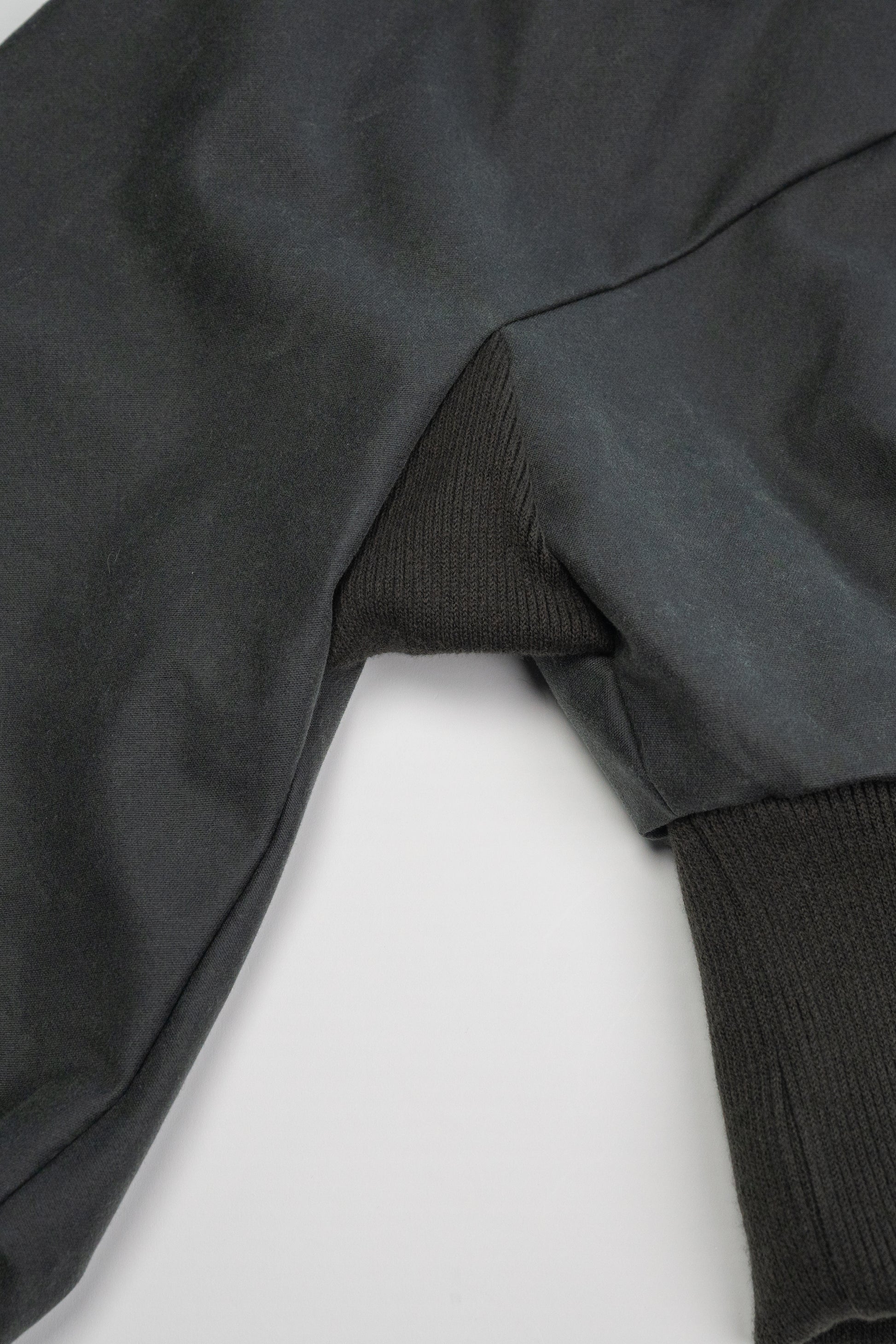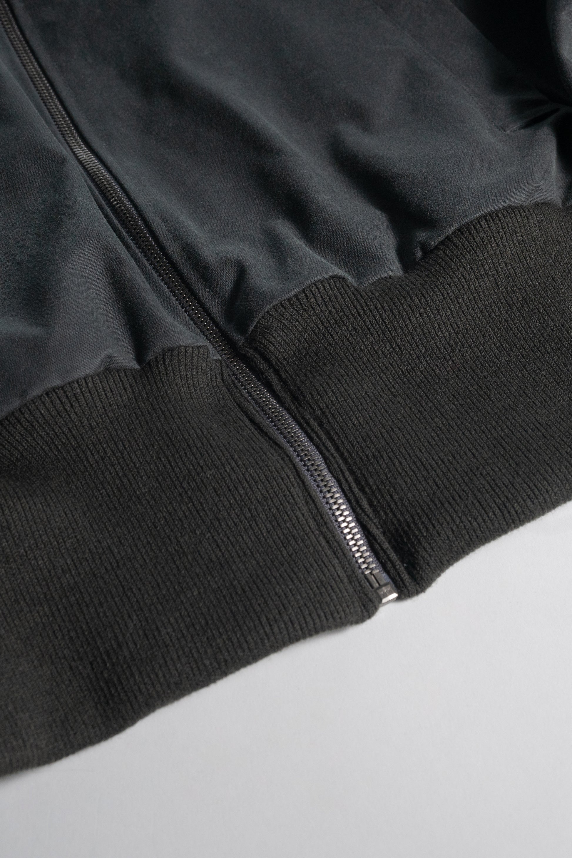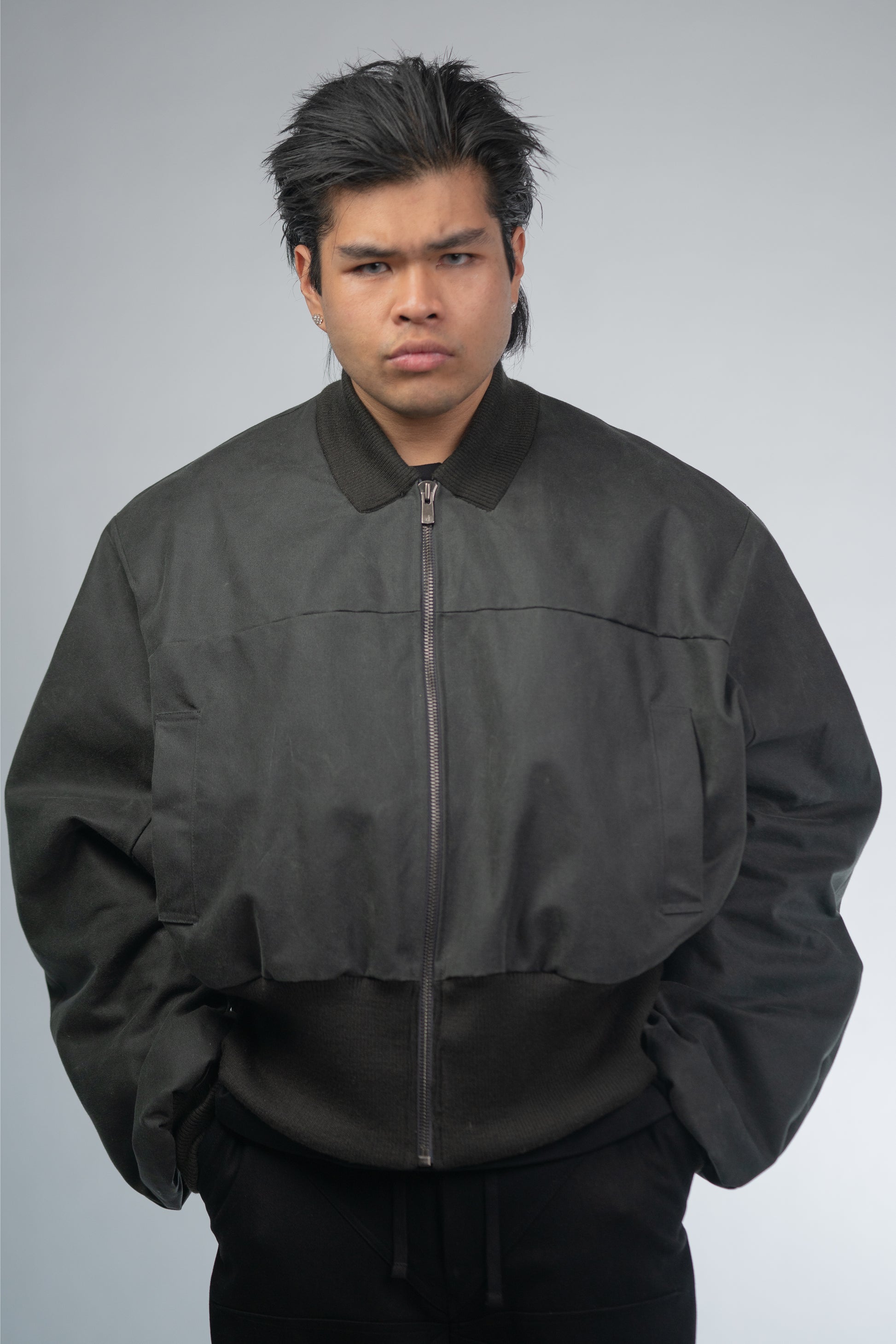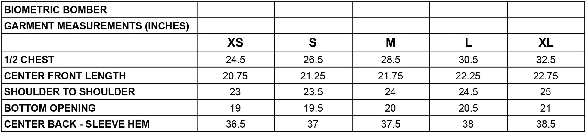 The Biometric Bomber Jacket features an oversized fit, cocoon shaped kimono sleeve with a ribbed gusset at the underarm, darts at the shoulder with shoulder pads, sharp angular stitch details and an elongated rib hem.