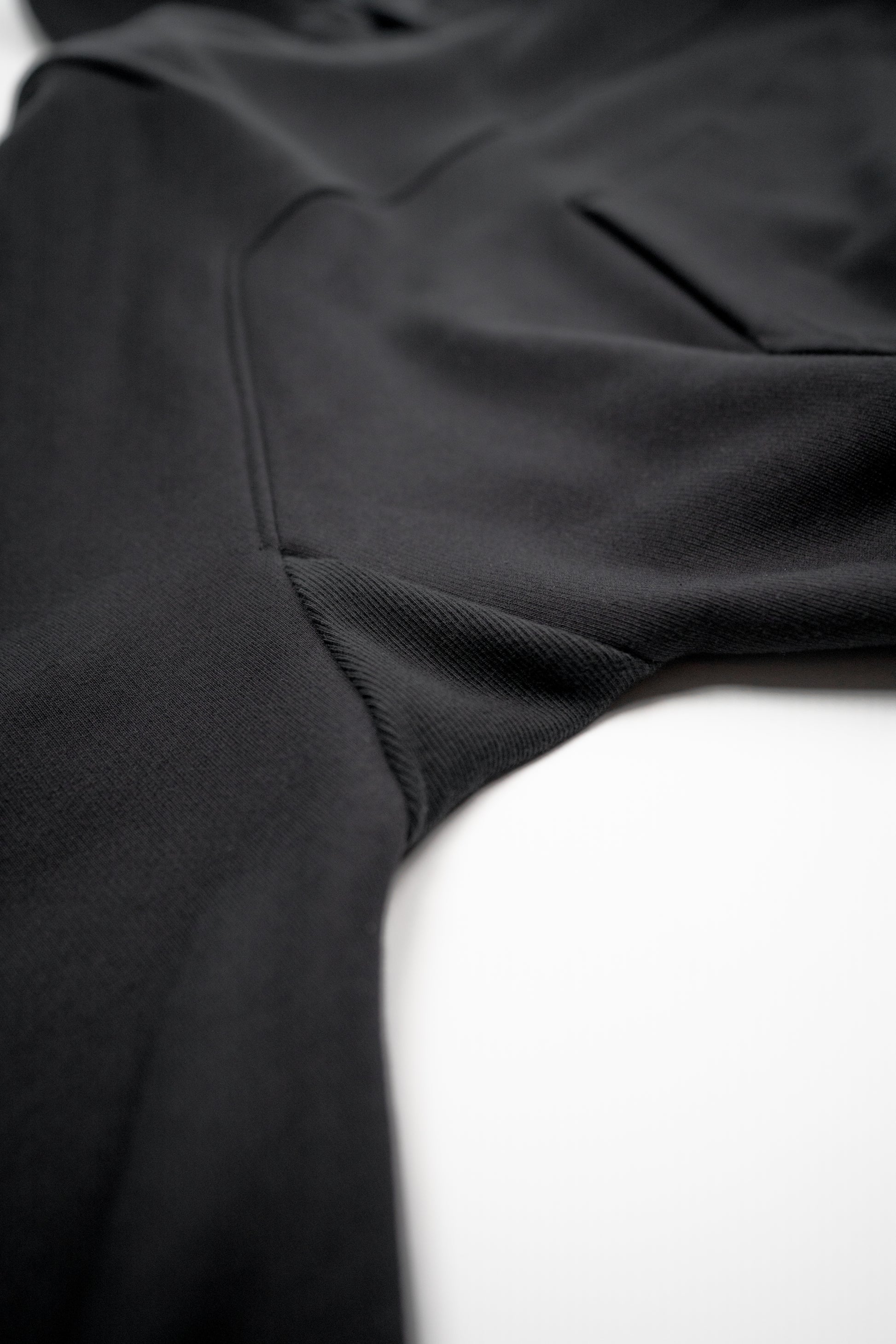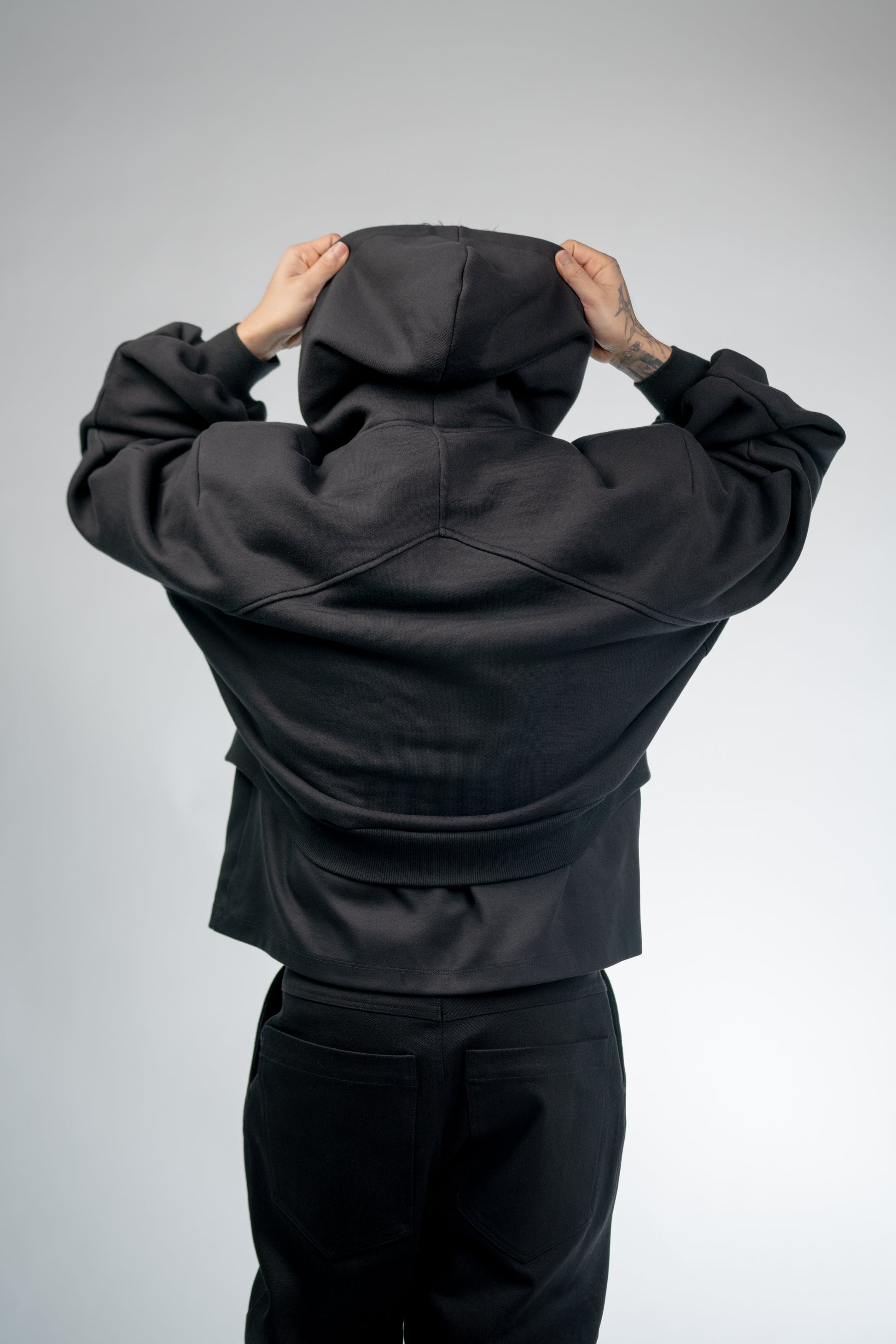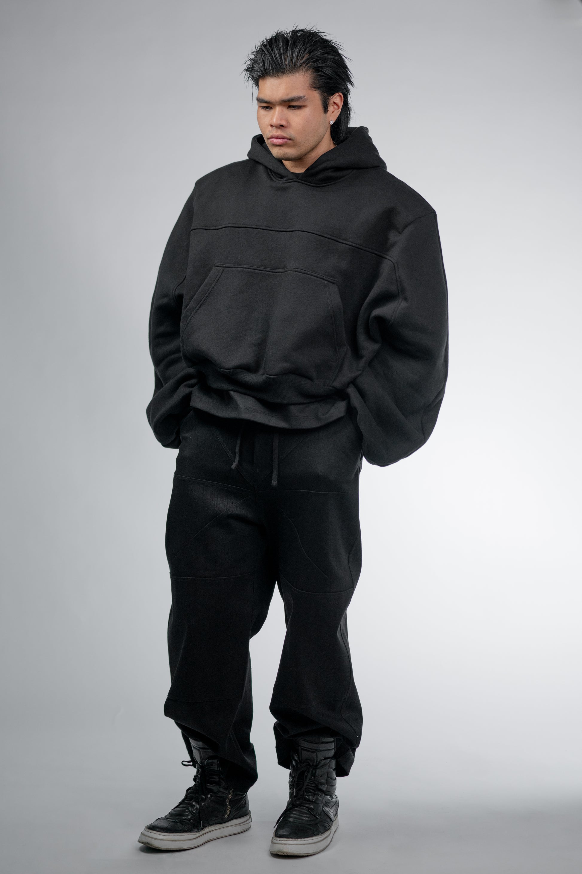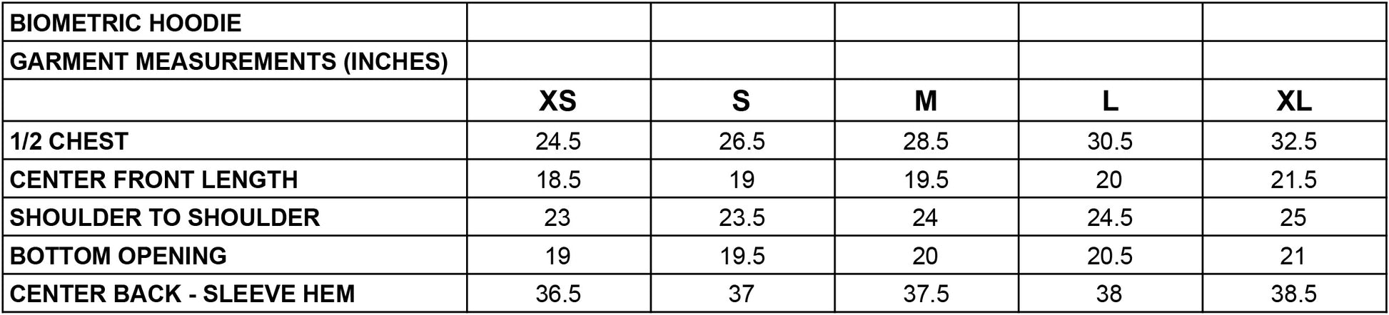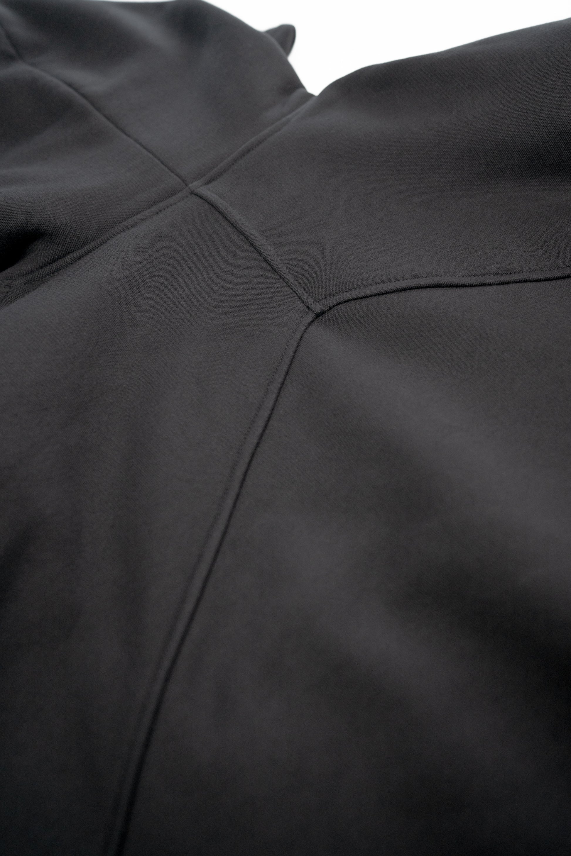 The Biometric Hoodie features an oversized fit, cocoon shaped kimono sleeve with a ribbed gusset at the underarm, darts at the shoulder with shoulder pads, sharp angular stitch details with rib cuffs and hem.