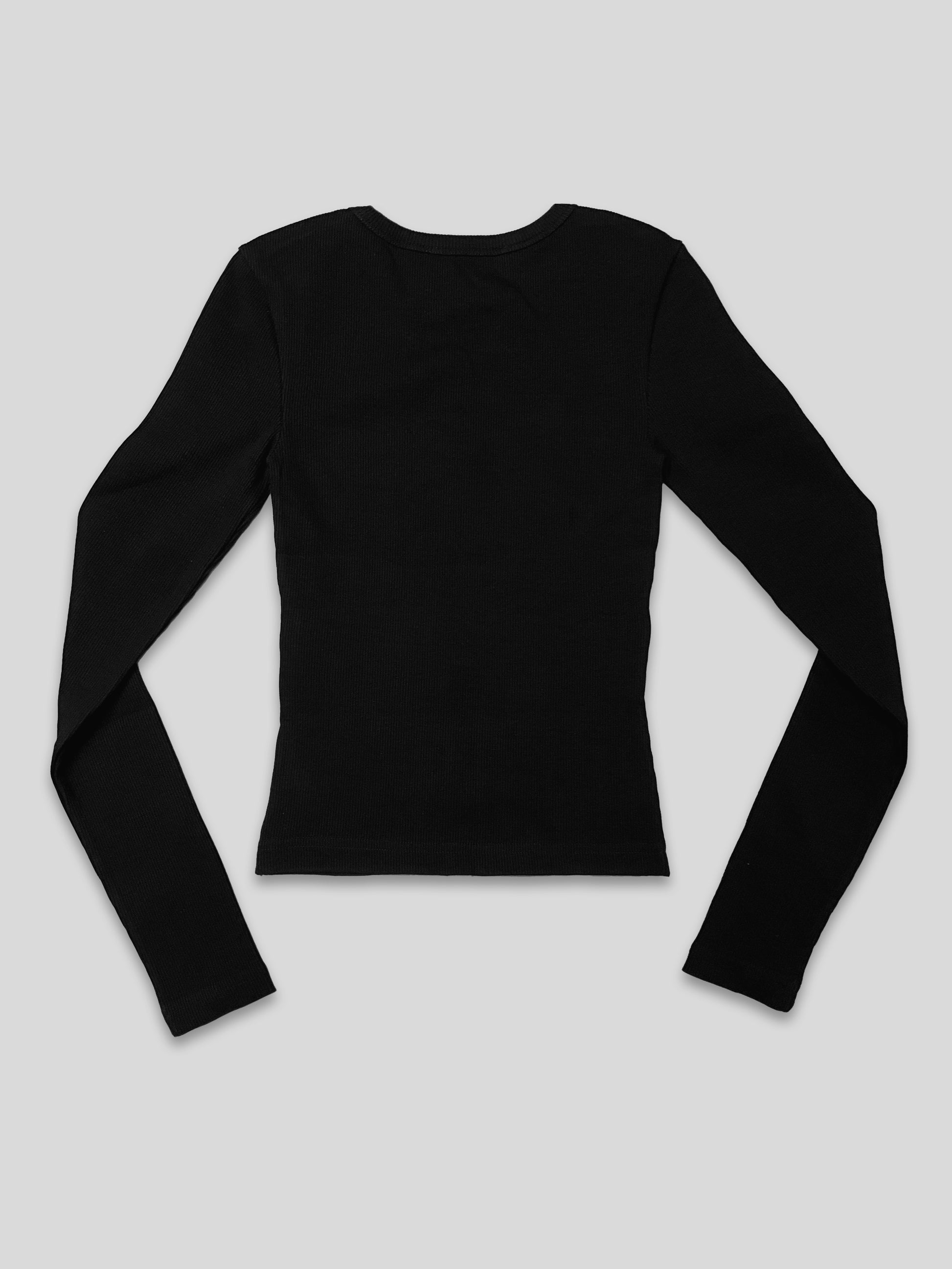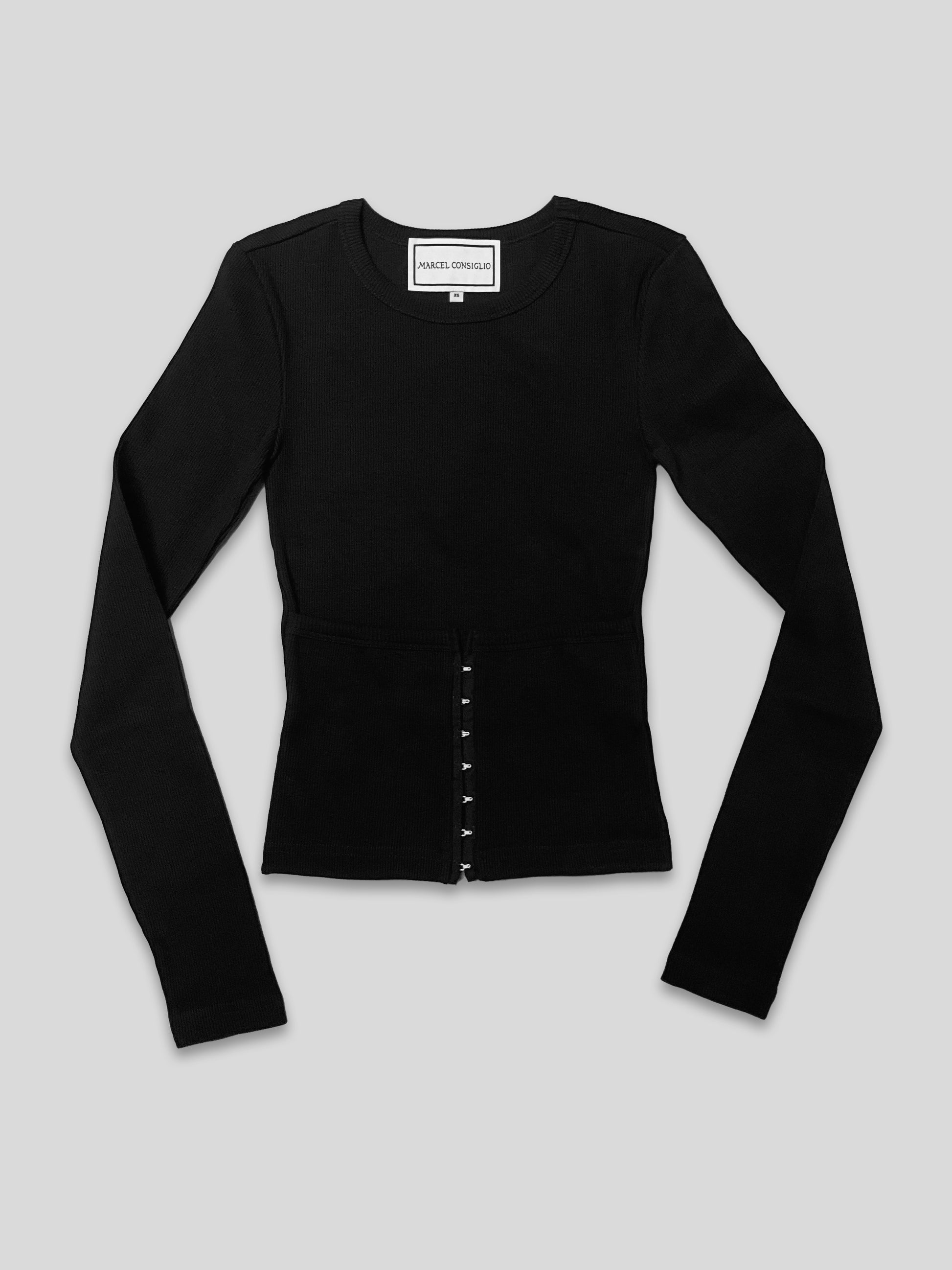 Our Corseted Long sleeve Shirt, meticulously crafted from a premium 1x1 rib knit blend of 98% Cotton and 2% Elastane. Designed with two side flaps that elegantly converge at the center front, secured by a discreet hook and eye closure.