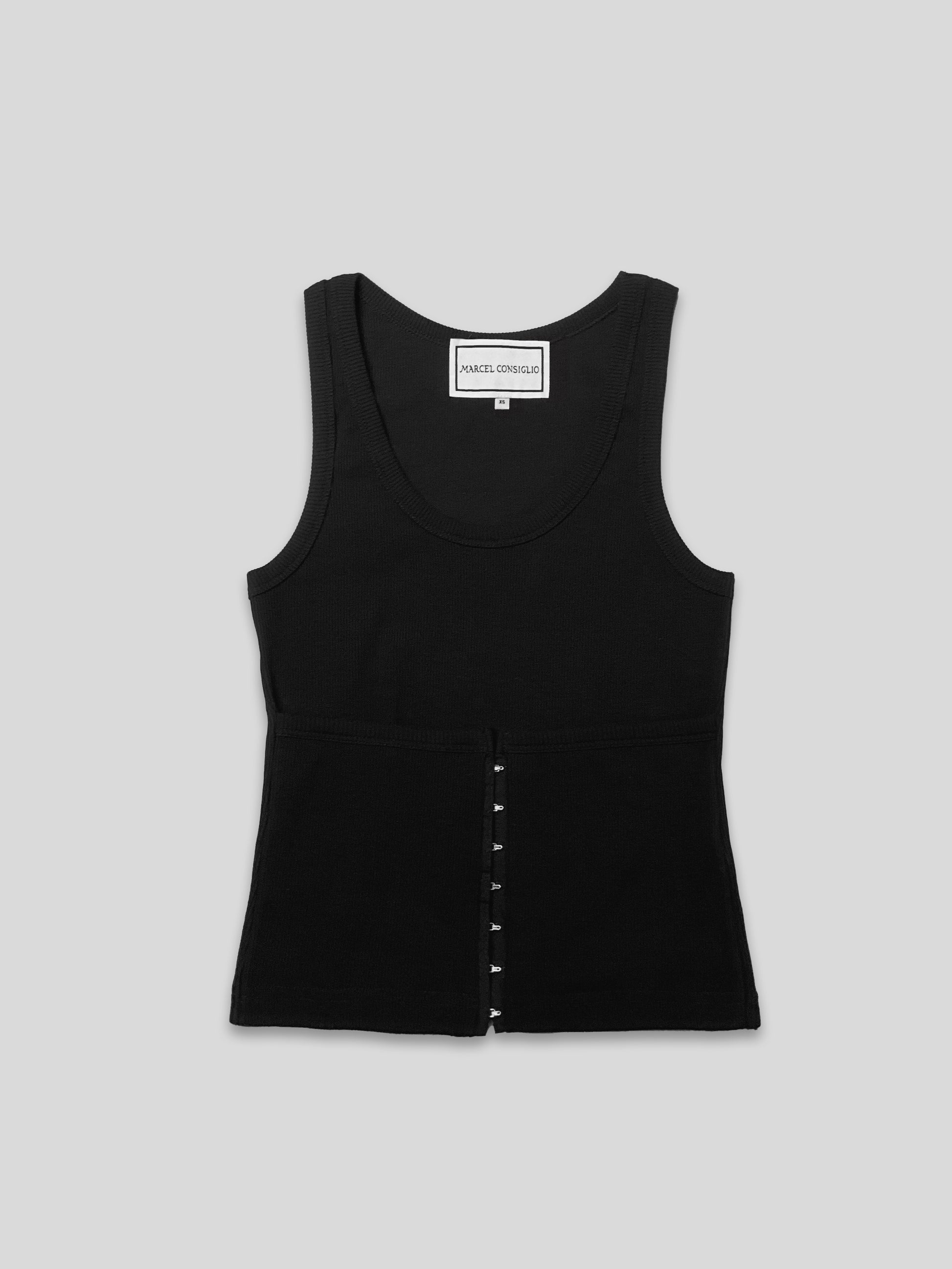 Our Corseted Tank, meticulously crafted from a premium 1x1 rib knit blend of 98% Cotton and 2% Elastane. Designed with two side flaps that elegantly converge at the center front, which resembles a corset, secured by a discreet hook and eye closure.