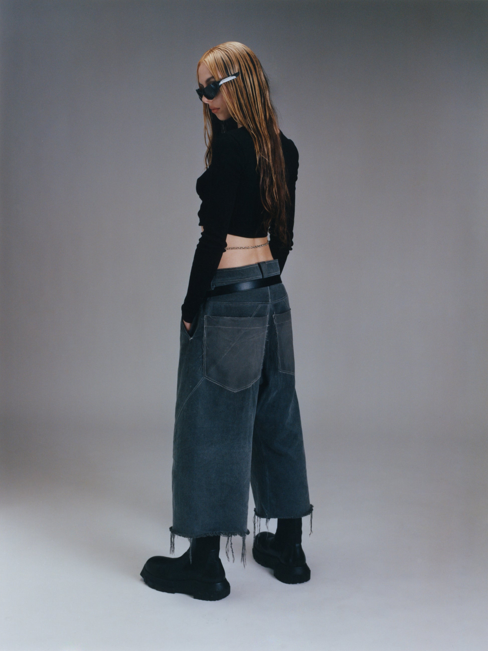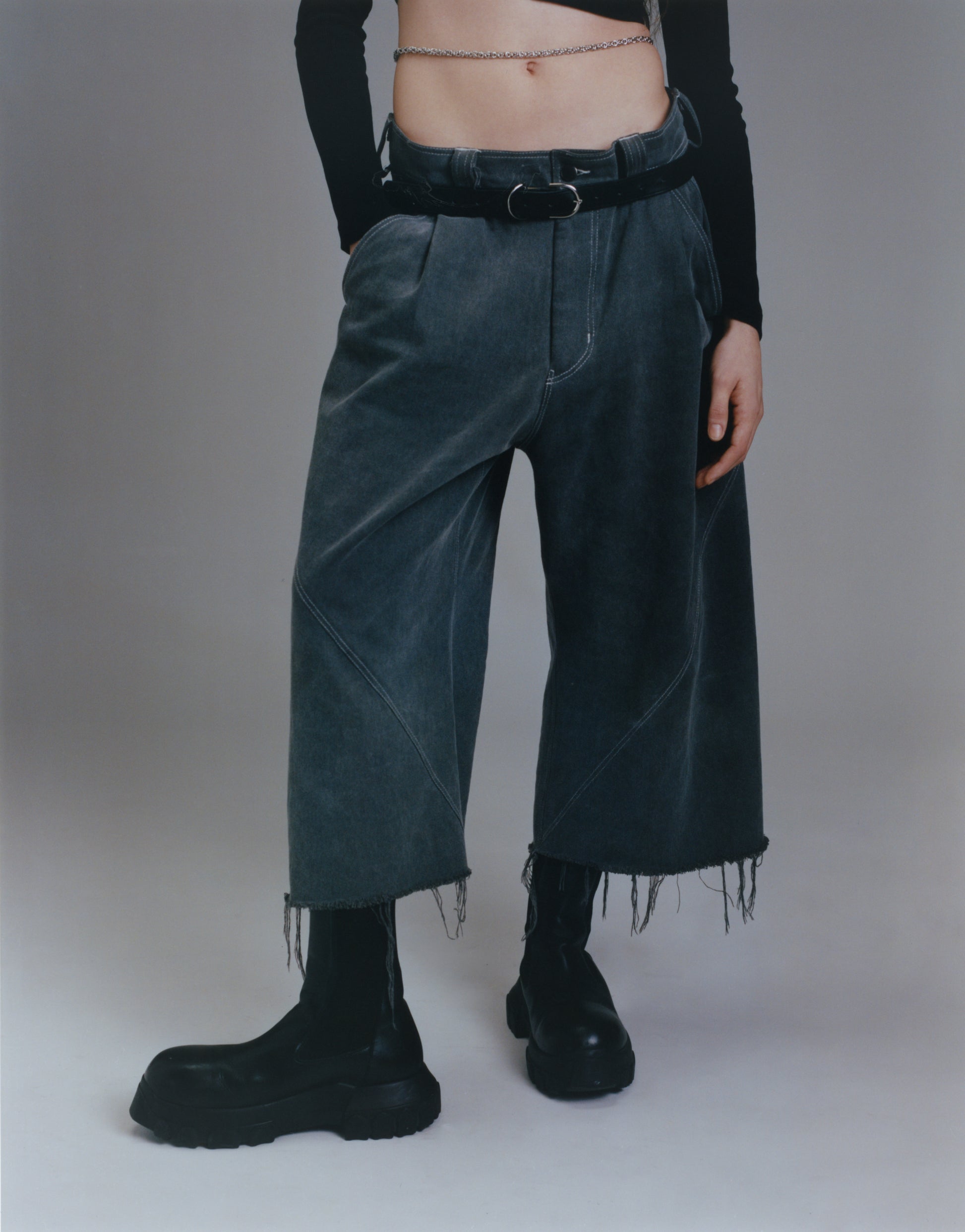 The Cropped Wide Leg Pant, designed with no outseam, replaced with a twisting seam which travels from the back yoke spiralling around the leg and finishes at the hem. It also features, quarter top pockets, oversized back pockets, front pleats, and standard zipper fly with button closure. The pants are made from 100% heavy weight cotton twill.