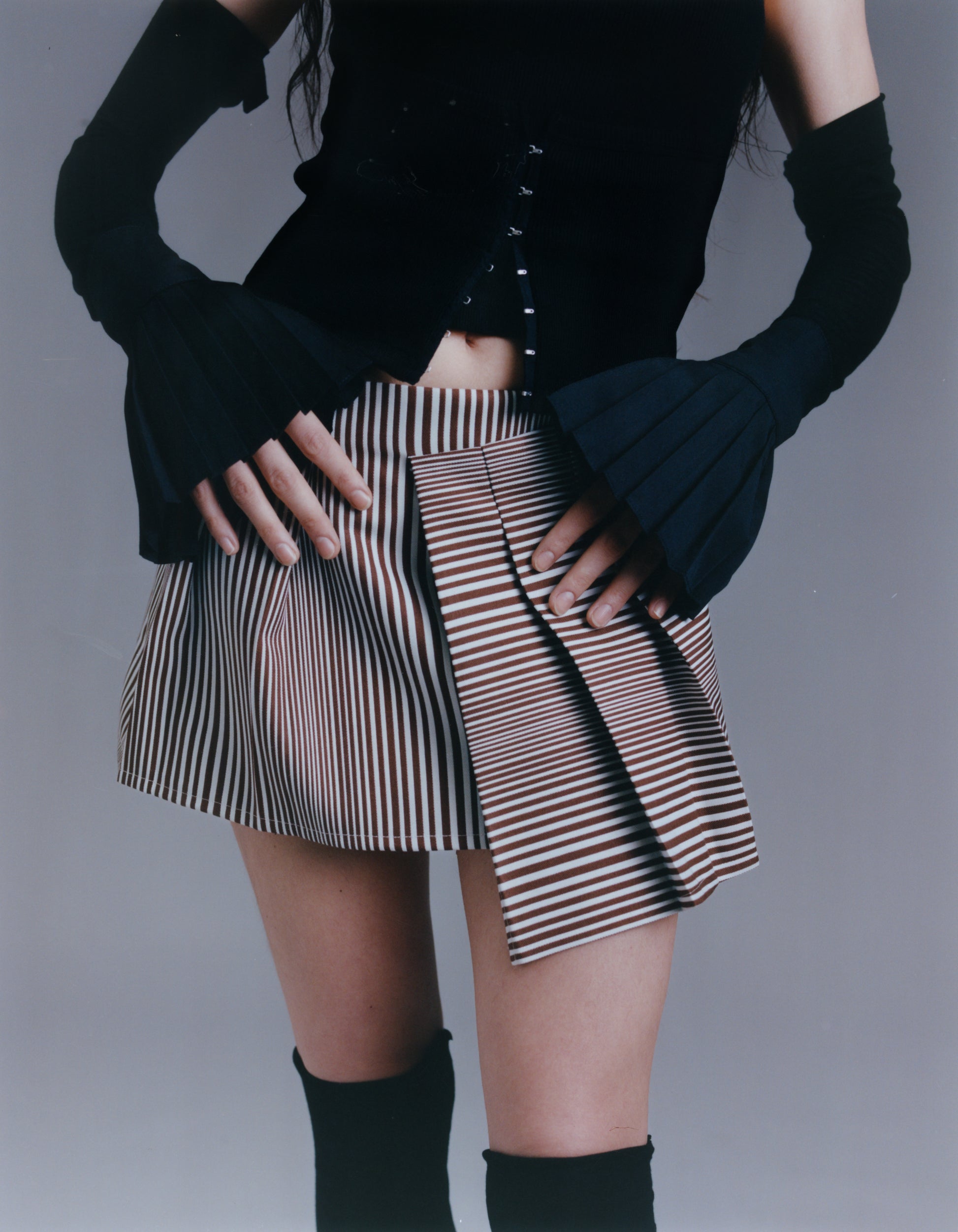 The Pleated Mini Skirt, designed with asymmetrical pleats. Features an invisible zipper opening in the center back. This skirt is fabricated using a 100% heavy weight cotton twill.