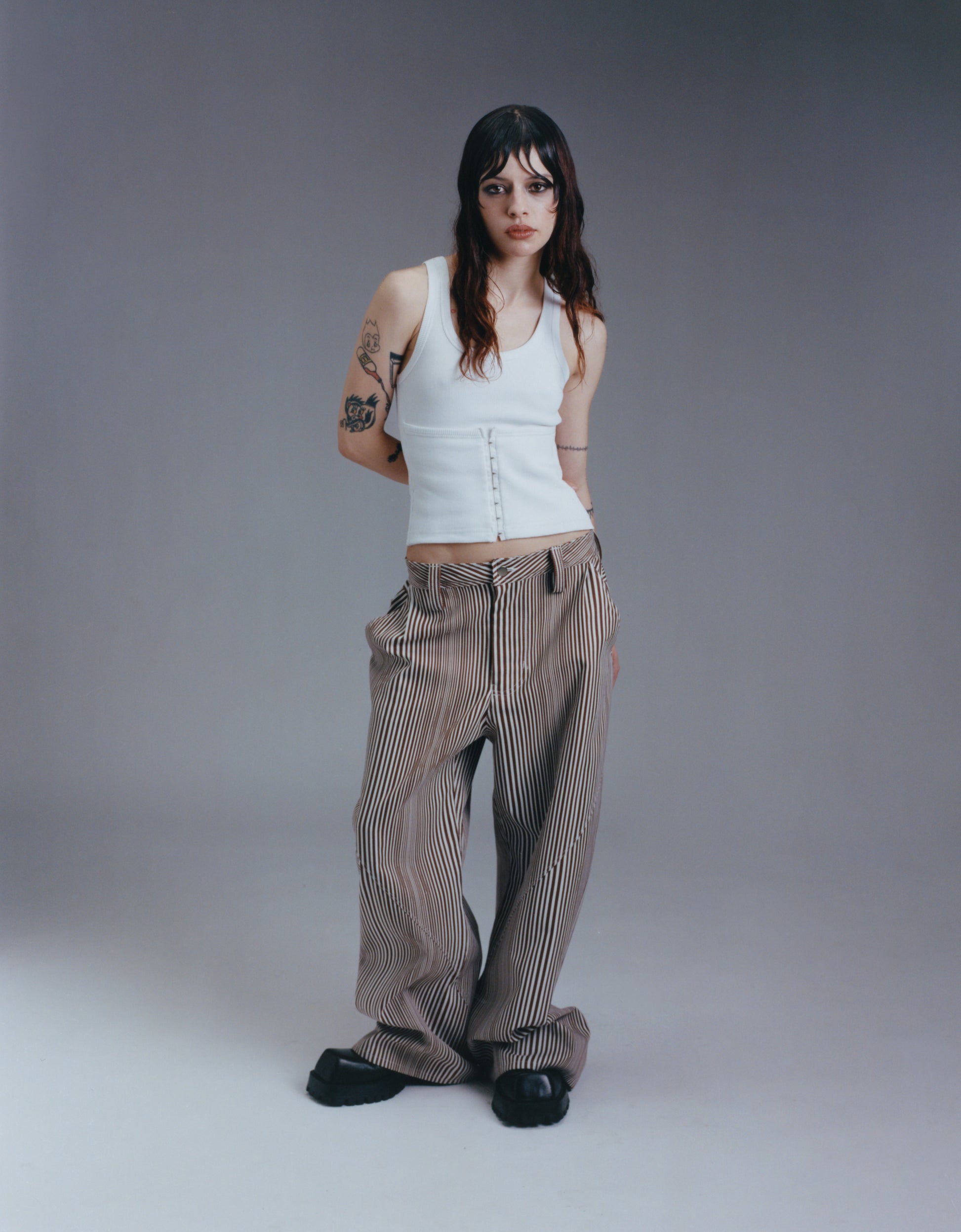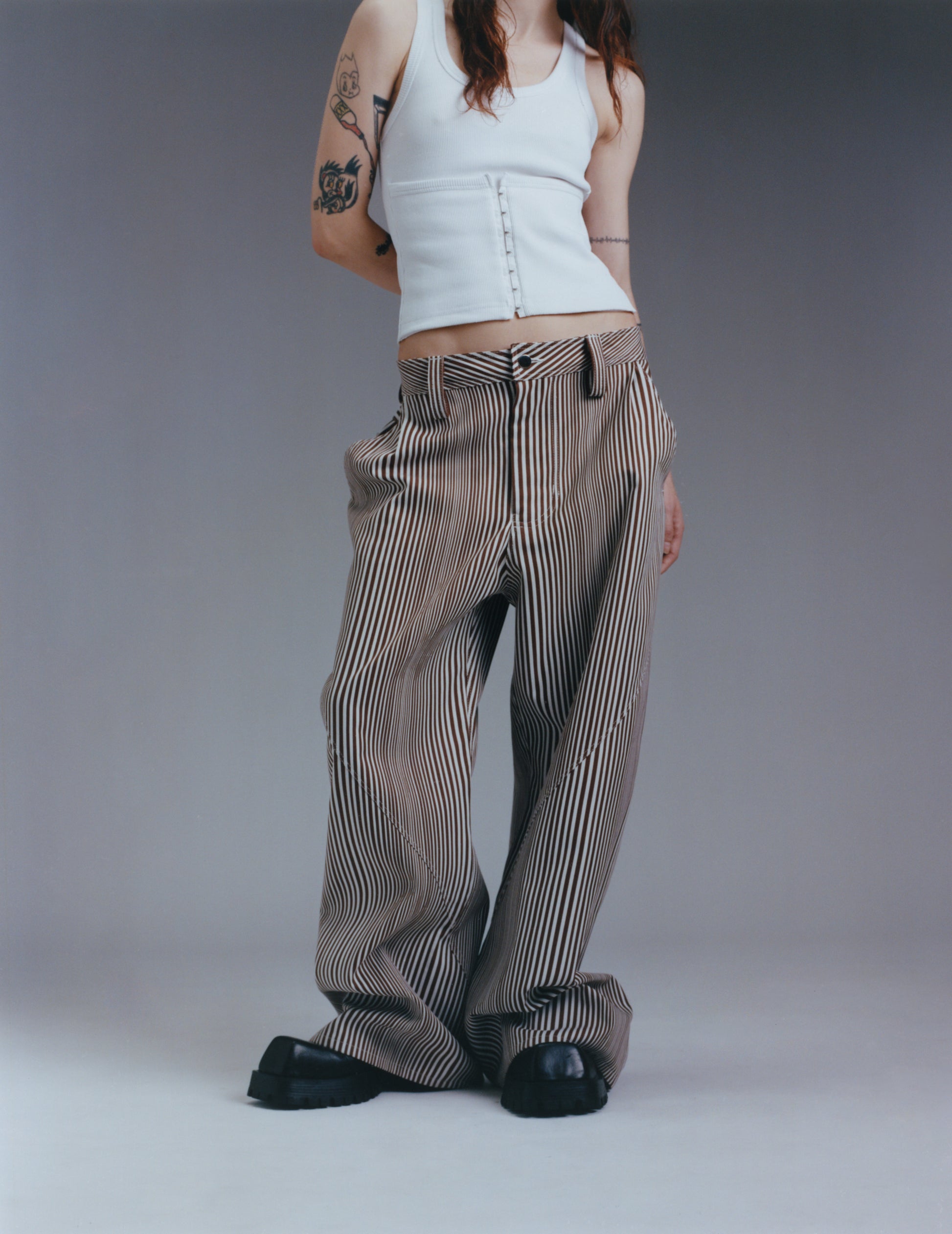 The Wide Leg Pant, designed with no outseam, replaced with a twisting seam which travels from the back yoke spiralling around the leg and finishes at the hem. It also features, quarter top pockets, oversized back pockets, front pleats, and standard zipper fly with button closure. This pant is fabricated using 100% heavy weight cotton twill.